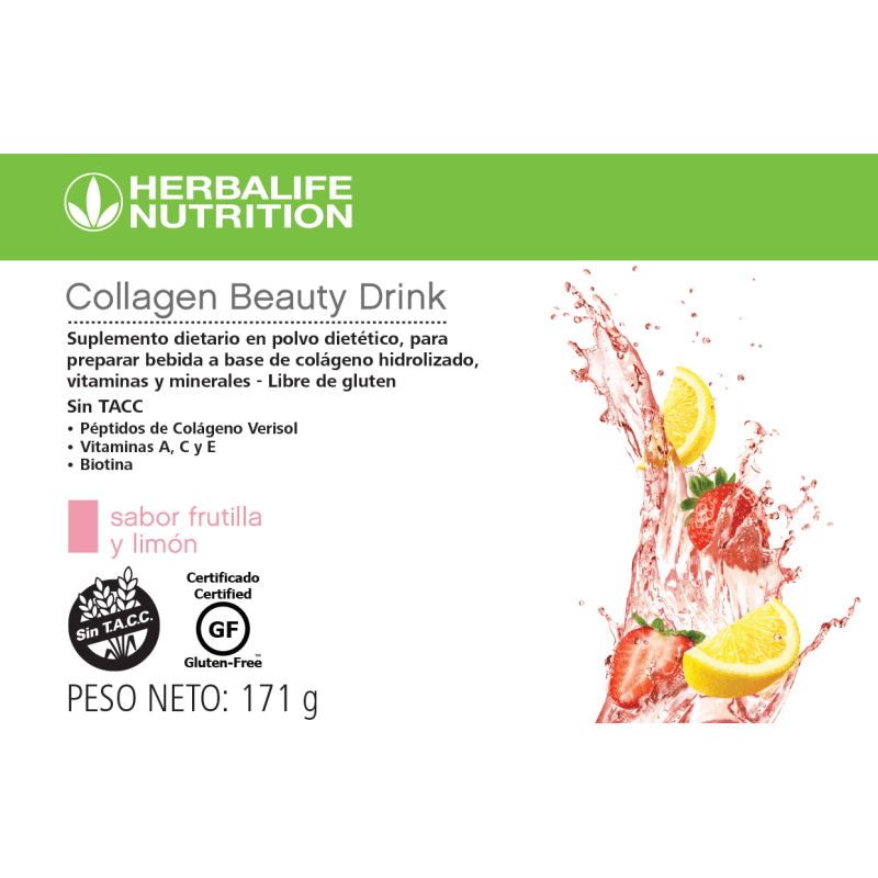 Collagen Beauty Drink. Su fórmula contiene: Péptidos de colágeno Verisol, vitaminas antioxidantes A (Betacaroteno), C y E, minerales: Selenio, Iodo, Zinc y Cobre, Biotina, Niacina. Solo aporta 20 calorías por porción.
